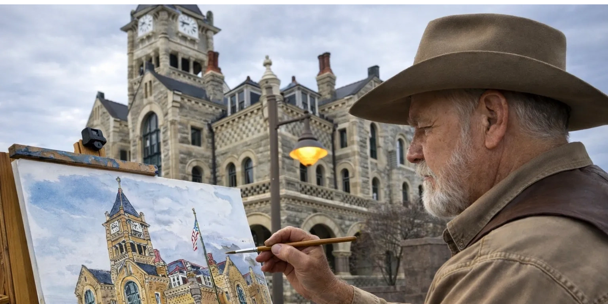 This pen-and-watercolor piece captures the inviting character of a Texas stone cottage, preserving its warmth and charm in ink and wash